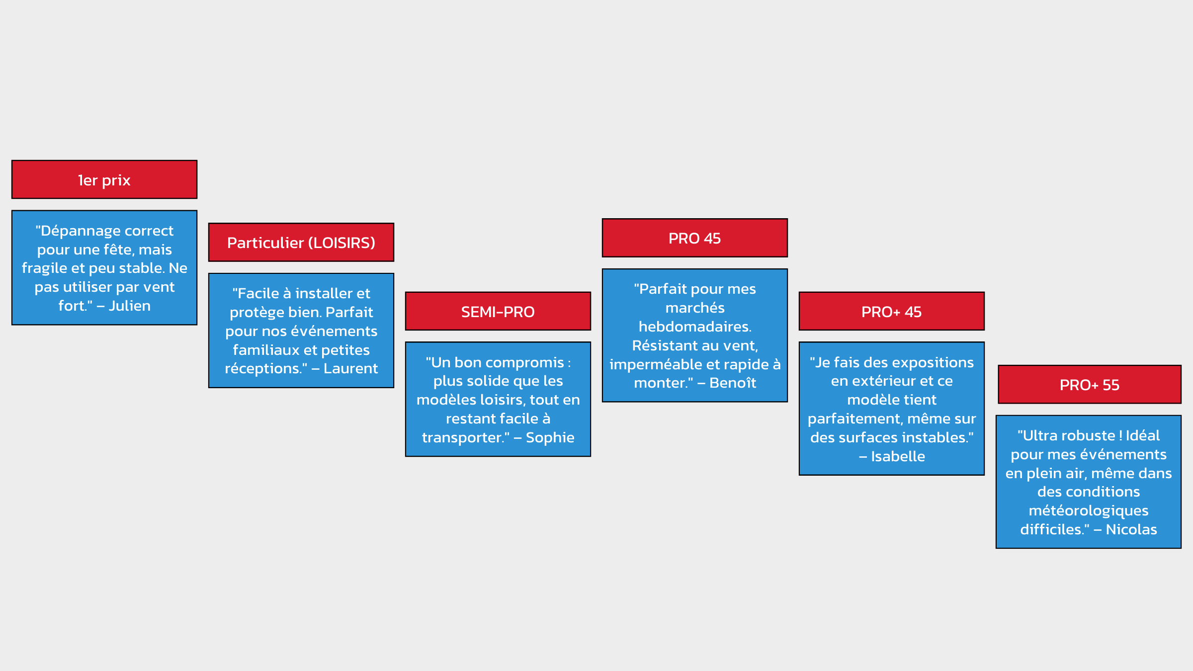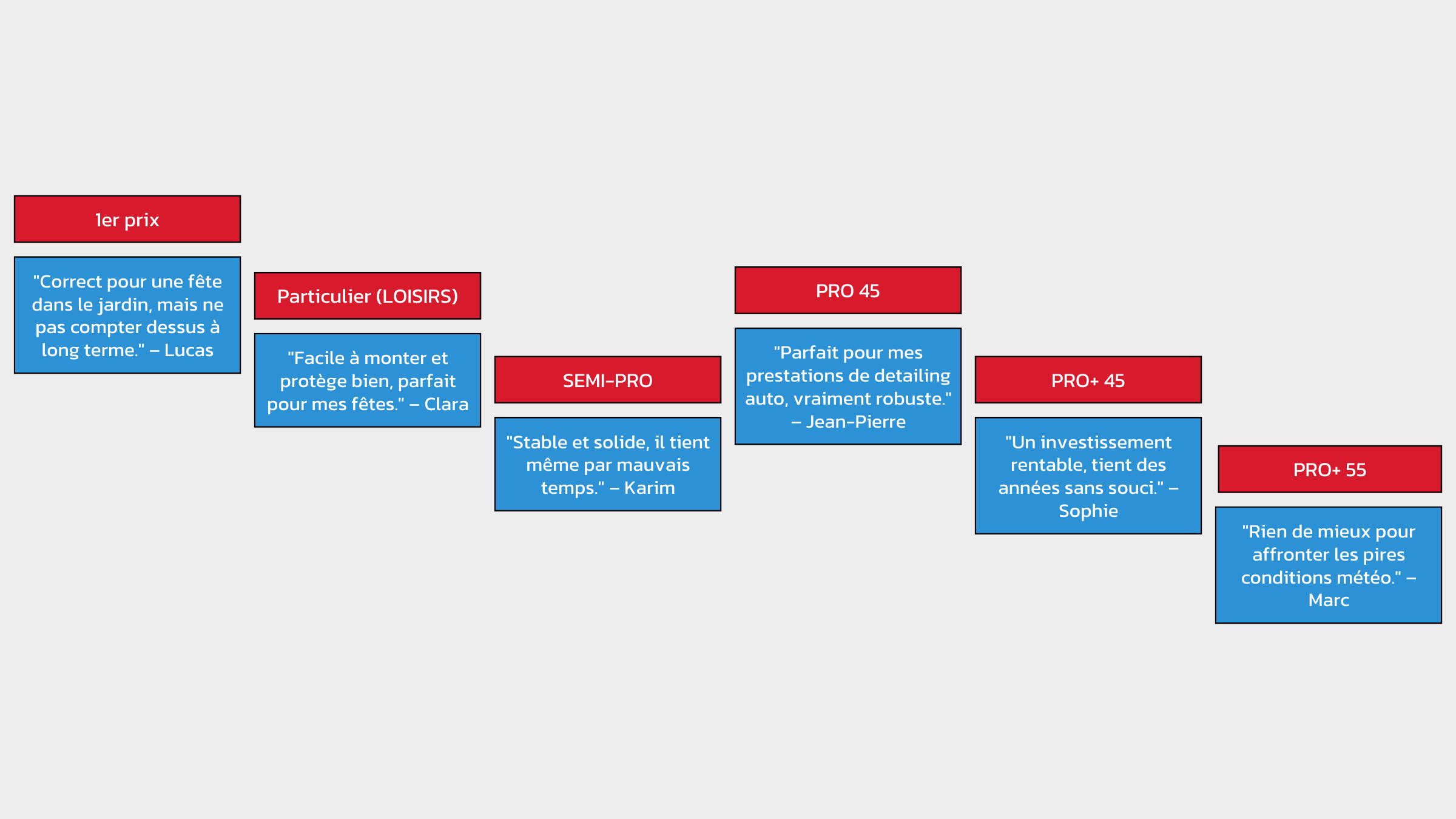 Que vous ayez un budget limité ou que vous souhaitiez un barnum offrant des fonctionnalités avancées, chaque gamme a ses avantages et ses limites. Ce guide vous aide à faire un choix éclairé parmi les trois gammes disponibles : 1er prix, entrée de gamme, et semi-pro.