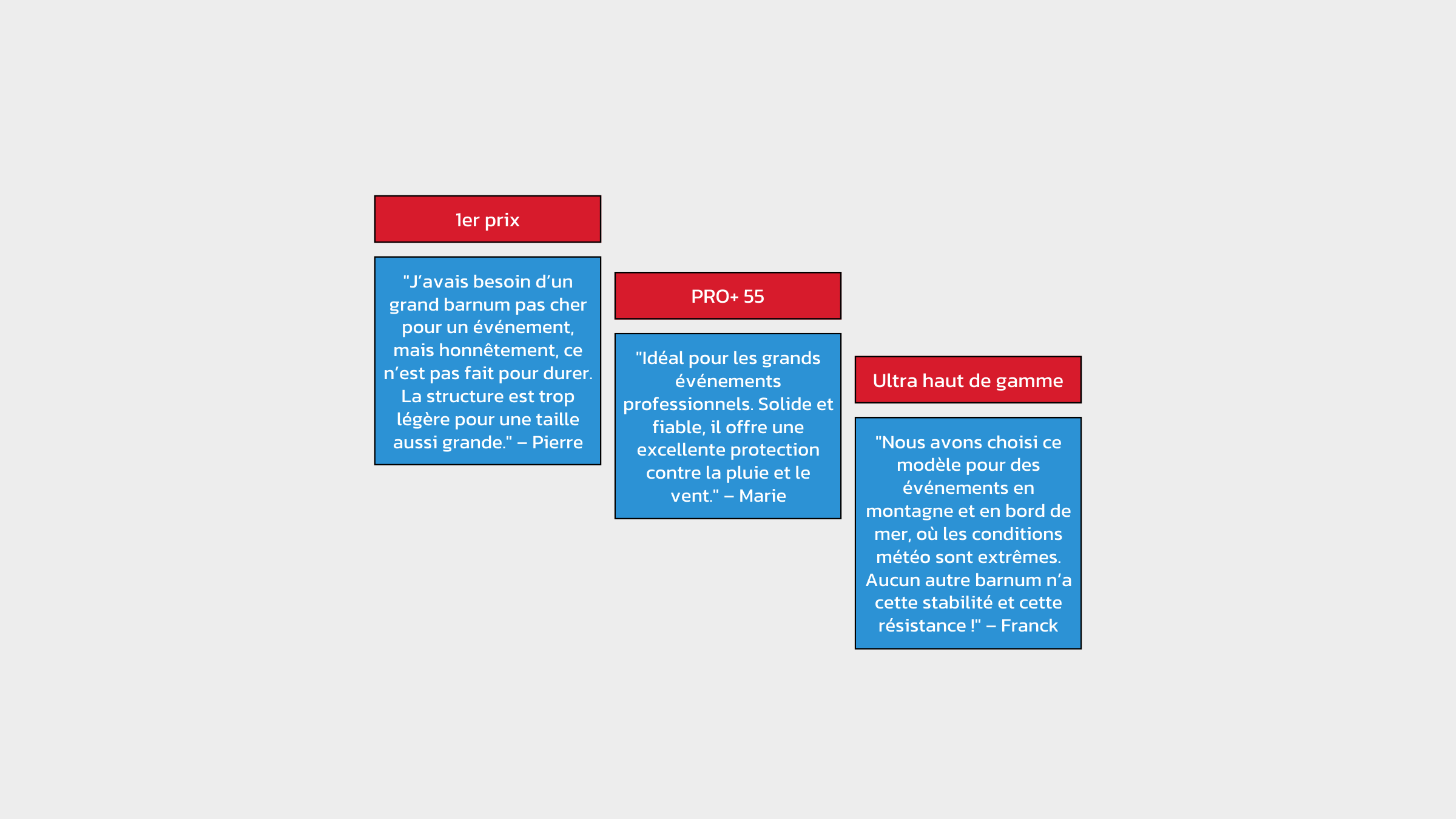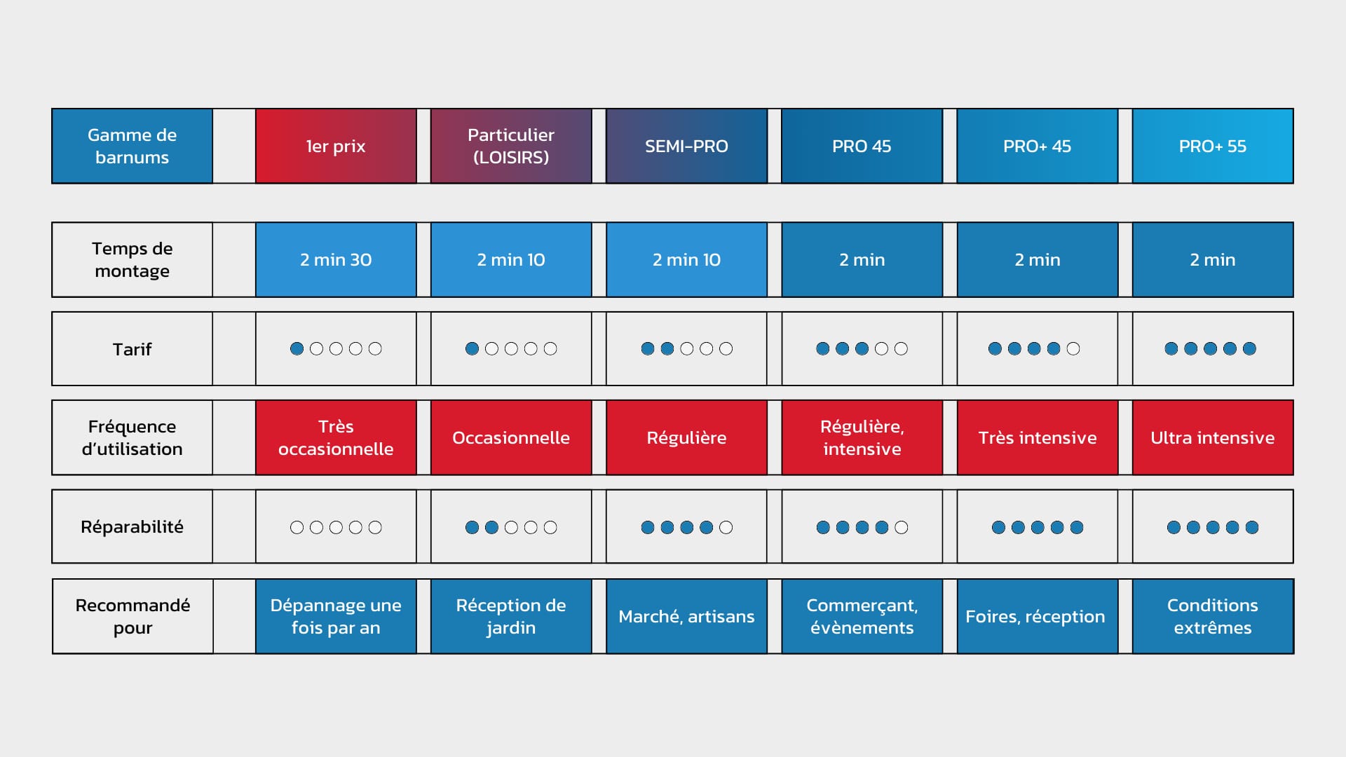 Le prix varie en fonction de la gamme, avec le barnum 1er prix offrant la solution la plus économique, bien que sa durabilité soit limitée. Le Pro+ premium est l’option la plus coûteuse, mais il justifie ce coût par une durabilité et une qualité supérieures.