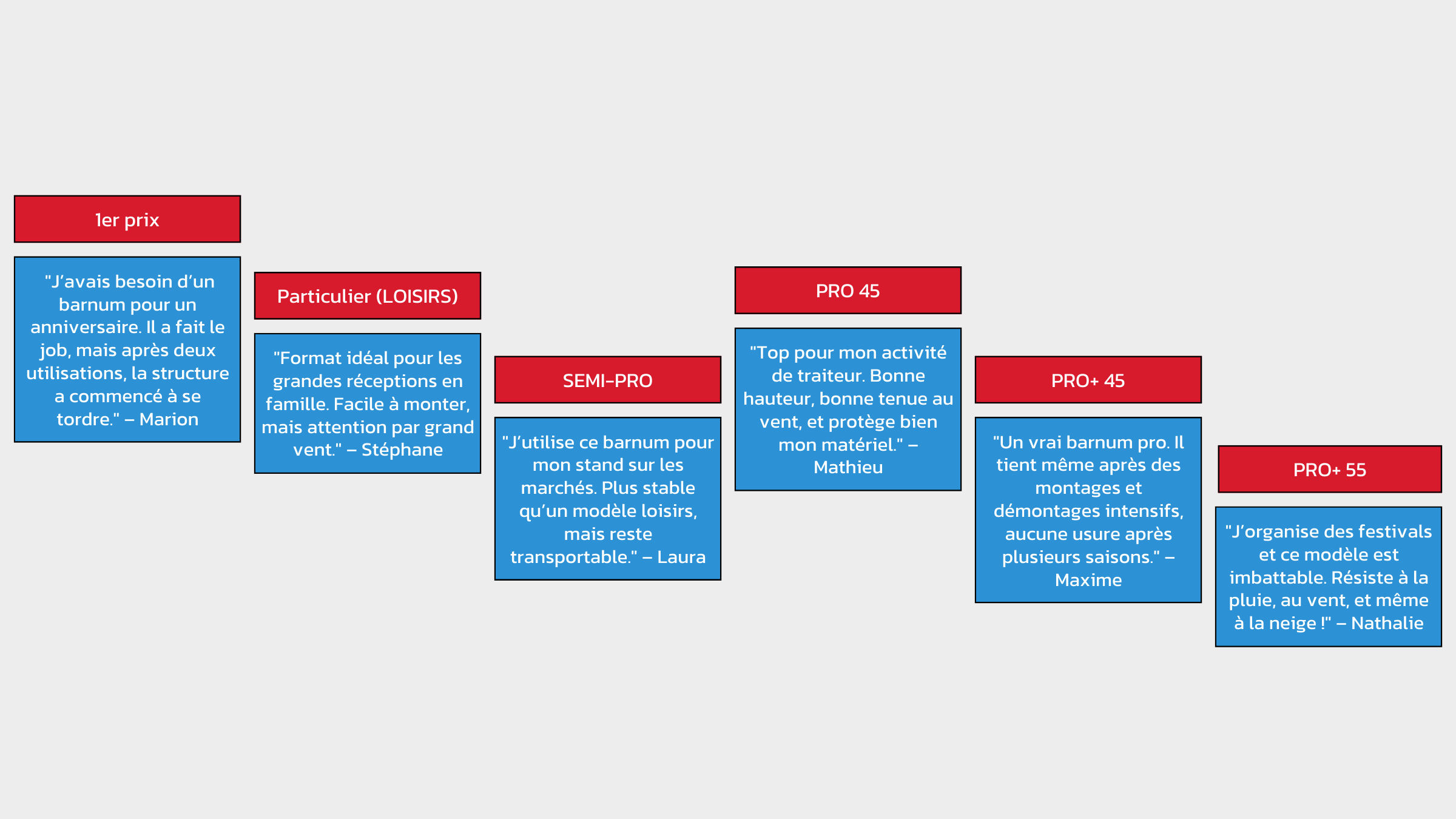 Les avis reflètent généralement la satisfaction des utilisateurs. Les barnums Pro et Pro+ premium reçoivent d’excellentes évaluations, mettant en avant leur fiabilité, leur robustesse et leur esthétique. En revanche, les barnums 1er prix reçoivent des avis mitigés, en raison de leur durabilité limitée et de leur adéquation uniquement pour des usages occasionnels.