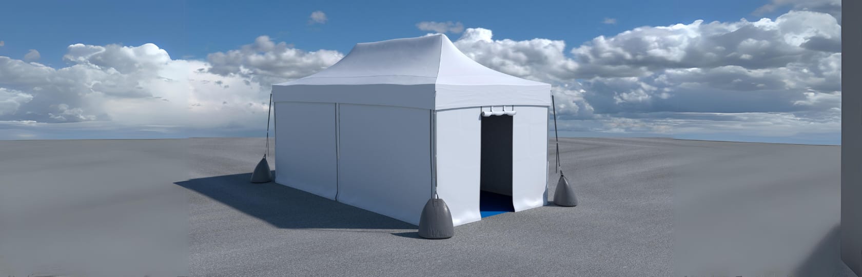 – Poids en Béton : Fournissent une excellente stabilité.– Poids à Remplir (Lest’O) : Peuvent être remplis d’eau ou de sable pour une solution flexible.Conseil : Placez les poids aux coins du barnum et vérifiez régulièrement leur position.